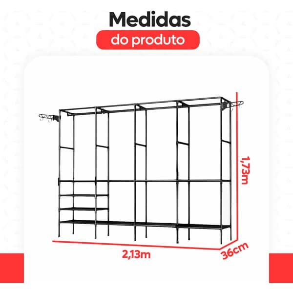 Sua construção em tubos de aço com acabamento antiferrugem garante durabilidade e resistência, enquanto as prateleiras bem distribuídas permitem acomodar sapatos, roupas dobradas, bolsas e outros itens de uso diário.