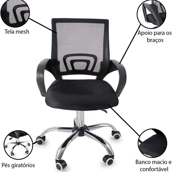 o assento e encosto são revestidos em tela mesh, um material que permite a circulação do ar e ajuda a manter a temperatura agradável durante longas horas sentado. Além disso, a cadeira conta com ajuste de altura através de uma alavanca, que permite uma posição adequada em relação à mesa. para garantir a postura correta durante o uso, a cadeira de escritório mesh giratória e ergonômica apresenta encosto com ajuste de inclinação e apoio para a região lombar. Também possui braços reguláveis, que se adaptam a diferentes necessidades.