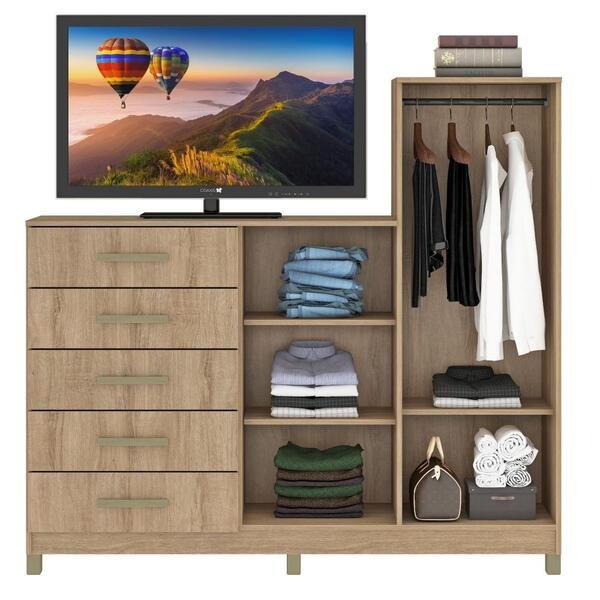 Cômoda Chicago 2 Portas 5 Gavetas Com Cabideiro E Pés Mel