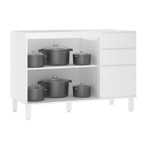 Este gabinete sem tampo oferece um espaço dinâmico e organizado para facilitar a sua rotina na cozinha. Ele é composto por três portas de abrir, uma prateleira e duas gavetas, oferecendo praticidade e organização para a sua cozinha.