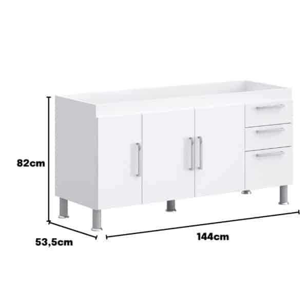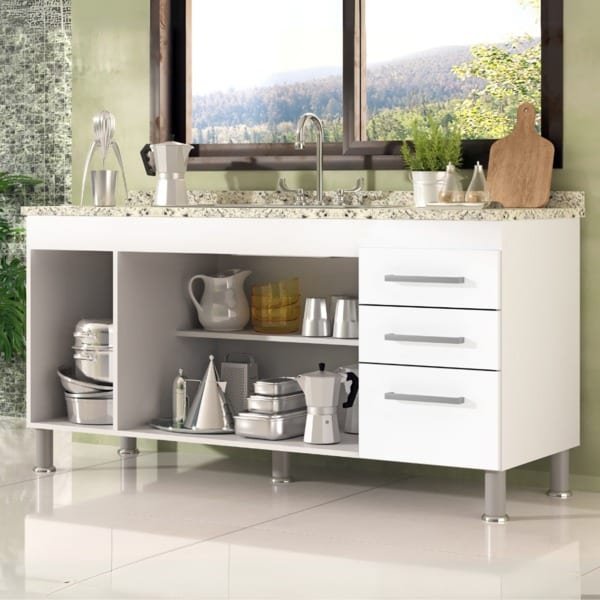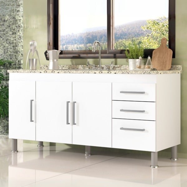 Este gabinete é produzido especialmente para pias de 1,50m, possui 3 gavetas com corrediças metálicas para melhor armazenar os itens de cozinha e conta com uma prateleira profunda completa no seu interior. Possui puxadores modernos e 5 pés para evitar empenamento da base, o gabinete é totalmente fabricado em MDP, aumentando a durabilidade, resistência e qualidade do produto. O gabinete NÃO ACOMPANHA o tampo da imagem.