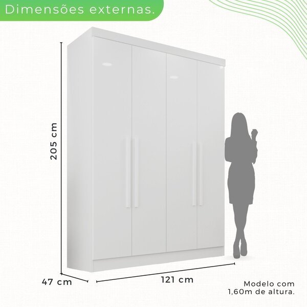 Guarda-roupa casal 4 portas 2 gavetas frança . Este lindo guarda roupa 4 portas 2 gavetas frança é um produto de excelente qualidade, diferenciado pela sua resistência, durabilidade, funcionalidade e beleza, ele é a melhor opção para deixar seu dormitório muito mais arrumado e convidativo. Com corrediças telescópicas que permitem uma abertura total das gavetas, parte interna espaçosa, divisões internas que oferecem praticidade e organização, puxadores de madeira que garante maior durabilidade, suporte embaixo das gavetas para dar uma sustentação reforçada e cabideiro em alumínio. Se encaixa facilmente em vários estilos de decoração com cores modernas. Aproveite, você merece! Estilo: moderno modular: não peso (kg): 68 garantia: 03 meses altura (cm): 205 largura (cm): 121 possui pés: não possui portas: sim tipo de porta: bater possui gavetas: sim tipo de gaveta: interna possui espelhos: não profundidade (cm): 47 gaveta com chave: não possui calceiros: não serviço montagem: 114259443 material da porta: mdp origem do produto: nacional ambiente principal: quarto material da gaveta: mdp material principal: mdp possui prateleiras: sim acabamento da porta: pintura uv tipo de guarda-roupa: casal espessura do fundo (mm): 3 material da prateleira: mdp peso máximo por gaveta: 3 espessura das portas (mm): 12 acabamento da prateleira: pintura uv tipo de puxador da porta: externo espessura da estrutura (mm): 12 peso máximo por prateleira: 3 tipo de corrediça da gaveta: metálica telescópica espessura das prateleiras (mm): 12 material do puxador da porta: mdf possui organizador de gaveta: não espessura do fundo das gavetas (mm): 3 tipo de dobradiça/corrediça da porta: telescópica fabricante: espresso móveis marca: espresso móveis cor: branco itens inclusos: 1 guarda roupa, kit ferragens e manual de montagem linha ou coleção: frança cor do puxador: branco quantidade de prateleiras: 06 prateleiras quantidade de portas: 4 portas quantidade de gavetas: 02 gavetas quantidade de portas com espelhos: nenhuma