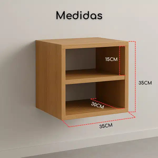 Material: MDP 12 mm Altura: 35 cm Largura: 35 cm Profundidade: 30 cm Altura de cada nicho: 15 cm Peso aproximado: 6 kg Instalação: Suspensa (fixação na parede)