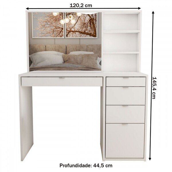 Produto Penteadeira Cor Branco Tonalidade Branco Marca Panorama Móveis Altura 145,00 cm Largura 120,00 cm Profundidade 45,00 cm Comprimento 45,00 cm Peso do Produto 44,81 Kg Garantia do Fabricante 3 mes(es)