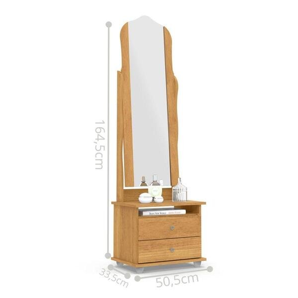 Este toucador é equipado com um ótimo espaço de armazenamento e um espelho deslumbrante, ele é ideal para organizar seus cosméticos e acessórios enquanto você se prepara para o dia. 02 gavetascorrediças metálicasespelho articulado de corpo inteiro dimensão do produtoaltura: 164,5 cmlargura: 50,5 cmcomprimento: 33,5 cm informações do produto: cor:cinamomo; material: mdp; sapatas protetora: sim ; gavetas: sim (2) gavetas com corrediças metálicas; pés: sim (4); nicho: sim (1); espelho: sim (1) itens inclusos: 1 toucador manual de montagem kit completo para montagem e manual de instruções garantia: 3 meses contra defeito de fabricação informações adicionais: – fotos meramente ilustrativas do produto no ambiente. – os objetos que ambientam as fotos não acompanham o produto; – verificar descrição e tamanho do produto antes da compra. – avaliar a mercadoria no ato do recebimento e recuse em caso de divergência ou danos. – mantenha as informações de contato e endereço de entrega atualizados para entrarmos em contato caso necessário. – limpar com flanela ou pano macio seco, não utilizar produtos abrasivos, desengordurantes, álcool ou solvente. Não expor o produto diretamente à luz solar e à umidade. * sugerimos a contratação de um montador profissional para a montagem do produto. Não nos responsabilizamos por danos causados no ato da montagem. * não nos responsabilizamos pela montagem e desmontagem do produto no ato da entrega e devolução, assim como os custos gerados nestas situações. * a transportadora entregará o produto no andar térreo do endereço de entrega. * não nos responsabilizamos por subir escadas, corredores e elevadores ou transporte por guincho em apartamentos.