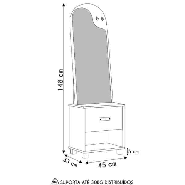 Se você está em busca de um móvel que alie praticidade, elegância e charme, o toucador penteadeira com espelho 1 gaveta organic freijó é a escolha perfeita para você. Desenvolvido pela renomada marca ej móveis, esse lindo toucador irá transformar o seu espaço em um verdadeiro camarim de beleza. com um design moderno e clean, o toucador organic se adapta facilmente a qualquer ambiente, seja ele uma suíte, closet ou até mesmo um quarto pequeno. Suas linhas suaves e acabamento impecável conferem um toque de sofisticação ao ambiente, deixando-o ainda mais elegante. O destaque desse móvel estilo penteadeira é o seu amplo espelho, que proporciona uma visão completa do seu rosto e cabelo, permitindo que você faça sua maquiagem ou arrume o cabelo com precisão. Já com a gaveta, você terá espaço suficiente para guardar seus produtos de beleza, como maquiagens, cremes, perfumes e acessórios. Tudo ficará organizado e ao alcance das suas mãos, facilitando a rotina de beleza do seu dia a dia. ah, e quiser, pode otimizar ainda mais a funcionalidade, ao dispor essa peça ao lado da cama e aproveitá-la como mesa de cabeceira. Demais, não é mesmo?! Então, não perca a oportunidade e adicione agora mesmo ao seu carrinho! dimensões do produto largura: 45 cm. altura: 148 cm. profundidade: 33 cm. peso: 14 kg. características do produto material da estrutura: mdp/mdf 15mm. acabamento: pintura uv escala de brilho: semifosco. peso suportado: 30 kg distribuídos. tipo de puxador: sintético. quantidade de gavetas: 1 gaveta. tipo de corrediças: telescópicas. quantidade de nichos: 1 nicho. material dos pés: madeira. possui espelho: sim. diferenciais: – design moderno. – pés em madeira com 5cm. – espelho alto estilo orgânico. – acompanha dois ganchos no painel. – puxador moderno com material sintético marrom. sistema de montagem: parafusos/cavilhas/minifix. manual de montagem: sim. complexidade da montagem: baixa. volumes: 1 volume. conteúdo da embalagem: 1 toucador. garantia do fabricante: 90 dias contra defeito de fabricação. montagem: recomendamos que seja feita por um profissional. recomendação de limpeza: utilize pano levemente úmido. observações importantes – produto para uso residencial em ambiente interno, não devendo ficar exposto diretamente ao sol, calor e umidades excessivas. – pode haver alguma diferença de tonalidade entre a imagem e o produto real, por conta do tratamento de imagens e a calibração de cores do seu monitor. – as imagens são meramente ilustrativas, não acompanham objetos de decoração e eletrônicos. – confira o estado da embalagem, não devendo assinar o comprovante em caso de danos. – não asseguramos, no ato da entrega, por subir escadas/elevadores, pelo transporte por guincho em apartamentos ou montagem, desmontagem e instalações. Eventuais despesas são por conta do comprador. – confira as dimensões do produto e certifique-se de que passará normalmente por supostos elevadores, portas, escadas e/ou corredores de sua residência.